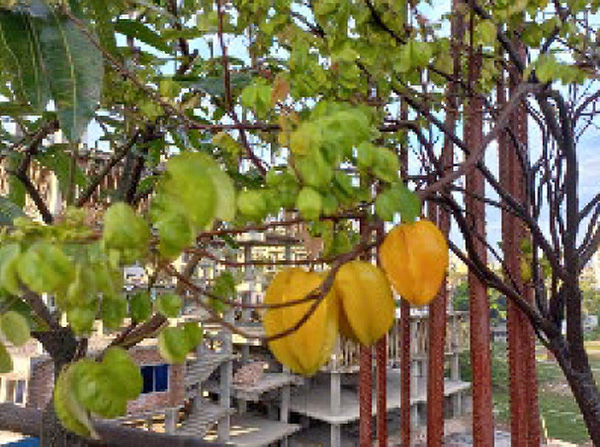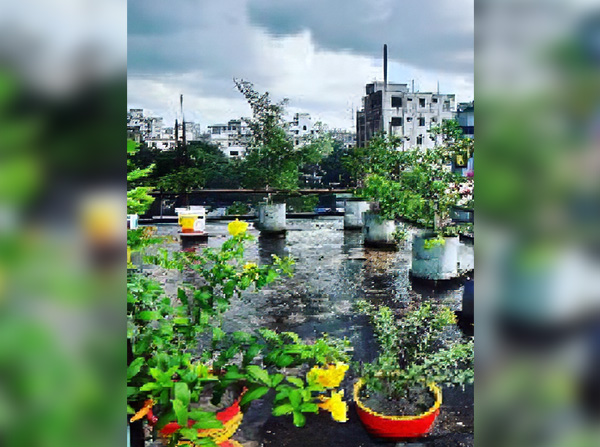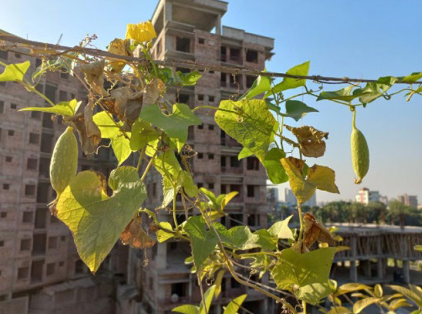 そしてダッカには植木屋がたくさんあることに気づきます。ダッカのビルや家屋の屋根の多くは平面なコンクリートで、洗濯干しや遊び場として利用されますが(通称「ルーフトップ」)、木々や果実をたくさん植えるので(写真⑤~⑧)、空から見ると緑色が目立ちます。ルーフトップで収穫した果実をオフィスで振るまってくれたりもします。このおかげで、猛暑でも、建物の気温が調整され、環境保健的にも良い効果があるのではと考え、研究への興味がそそられます。